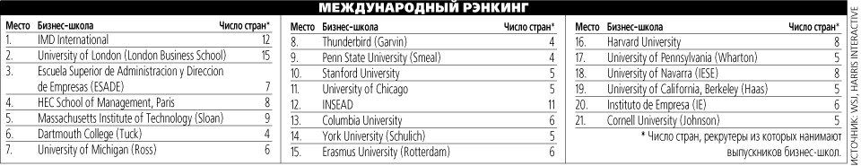 Работодатели сделали выбор. В мировые лидеры попали бизнес-школы, привлекающие больше всего рекрутеровРональд Олсоп Какую бизнес-школу считать лучшей? Четвертое ежегодное исследование, проведенное газетой The Wall Street Journal с помощью маркетингового агентства Harris Interactive, дает на этот вопрос три ответа. Международный рэнкинг(Открывается в новом окне) Рэнкинг лучших бизнес-школ, составляемый The Wall Street Journal, отражает мнение корпоративных рекрутеров о школе, качестве программ в рамках курса МВА, уровне подготовки студентов. В этом году впервые был составлен международный рэнкинг, в который вошли только школы, выпускников которых нанимают рекрутеры из разных стран. Лучшей школой рекрутеры признали International Institute for Management Development (IMD), расположенную в Лозанне, Швейцария. В двух других рэнкингах представлены североамериканские школы; в основном это, конечно, школы США, но в списке есть и несколько канадских и мексиканских школ (см. стр. В2). В первый, национальный, рэнкинг включены 19 наиболее известных и крупных бизнес-школ, с которыми работают крупные национальные и транснациональные компании. Во втором, региональном, рэнкинге 44 бизнес-школы; обычно это менее крупные школы, которыми в большей степени интересуются местные и региональные компании. В бизнес-школах из национального рэнкинга будущих менеджеров ищет в среднем 331 рекрутер, из регионального 81. Первые места в них занимают Ross School of Business при University of Michigan и Krannert School of Management при Purdue University соответственно. Кроме того, исследователи составили рэнкинг бизнес-школ по ряду дисциплин: в каждой дисциплине были выбраны пять школ с наиболее высоким, по мнению рекрутеров, качеством обучения. Еще в один список вошли школы, которые рекрутеры называли чаще всего, говоря о выпускниках с высокими этическими стандартами. В этих опросах, однако, участвовали только рекрутеры из США, поэтому школ из других стран в них практически нет (см. стр. В3). В международный рэнкинг вошли восемь европейских школ и 13 американских (последних также можно найти в американских рэнкингах). Первые четыре места занимают европейские бизнес-школы, что в значительной степени объясняется их привлекательностью для огромного числа рекрутеров. Так, London Business School (2-е место), которую особенно высоко ценят финансовые компании, привлекает рекрутеров из 15 стран, а с лидером IMD работают рекрутеры из 12 стран. Компании разных стран традиционно проявляют высокую активность, ища сотрудников во французской INSEAD (11 стран), однако она сильно упала в глазах многих рекрутеров, поэтому занимает лишь 12-е место. London Business School, IMD, парижская HEC School of Management и барселонская Escuela Superior de Administracion y Direccion de Empresas (ESADE) также получили более высокие оценки, чем многие американские школы, в категории налаженное сотрудничество и по ряду показателей в восприятии рекрутеров, в особенности в таких областях, как опыт и знания в области международного бизнеса. Из американских школ самая популярная среди рекрутеров Sloan School of Management при Massachusetts Institute of Technology (5-е место, рекрутеры из девяти стран), а самая высокая репутация в области обучения по программе международный бизнес у Thunderbird (Garvin School of International Management). Последняя, однако, заняла лишь 8-е место, так как рекрутеры лишь из четырех стран нанимали ее студентов. Многие, впрочем, говорят, что будут продолжать посещать Thunderbird и, возможно, на