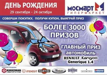 В сети гипермаркетов "МОСМАРТ" проходит акция "День рождение"С 29 сентября по 24 октября в сети гипермаркетов "МОСМАРТ" проходит акция "День рождение", посвященная двухлетнему юбилею компании. В рамках акции на территории прилегающих к гипермаркетам паркингов пройдут культурно-массовые мероприятия, концерты, викторины с вручением сувениров. Маленьких покупателей встретят ростовые куклы и клоуны, которые покатают их на пони, а также предложат весело провести время в специальной детской зоне т/ц. Среди детей будет проведен конкурс рисунка. Победителям, которые определятся путем голосования посетителей, будут вручены подарки. Все покупатели, совершившие покупку в "Мосмарте" в этот период, смогут принять участие в лотерее и выиграть главный приз - автомобиль Renault Kangoo, а также холодильник, электробытовую технику и другие призы. К акции приурочен запуск программы лояльности клиентов "Мосмарт", участником которой может стать любой покупатель. Участие в программе дает держателям карт ряд преимуществ - скидки на товары, накапливаемый бонус на персональном счету, приоритетное участие в распродажах и дегустациях, беспроцентный кредит, оплату покупок на эксклюзивной кассе и др. Кроме того, при оформлении карты лояльности, покупателю вручается комплект карт на членов его семьи. ![]() |