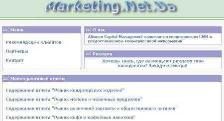 В украинском сегменте интернет запущен специализированный веб-сервис для маркетологовКомпания Alliance Capital Management объявила о запуске нового веб-сервиса, созданного совместно с компанией Universal Consulting Group. Данный проект ориентирован на сотрудников отдела маркетинга коммерческих компаний, а также рекламных и маркетинговых агентств. Целью проекта www.marketing.net.ua является оперативное предоставление информации специалистам об интересующем рынке и потребительских предпочтениях. На данный момент веб-сервис www.marketing.net.ua предлагает маркетинговую информацию по наиболее популярным товарным категориям - рынкам продуктов питания, напитков, розничной торговли, бытовой техники, средствам гигиены и товарам бытовой химии, их количество постоянно расширяется. ![]() |