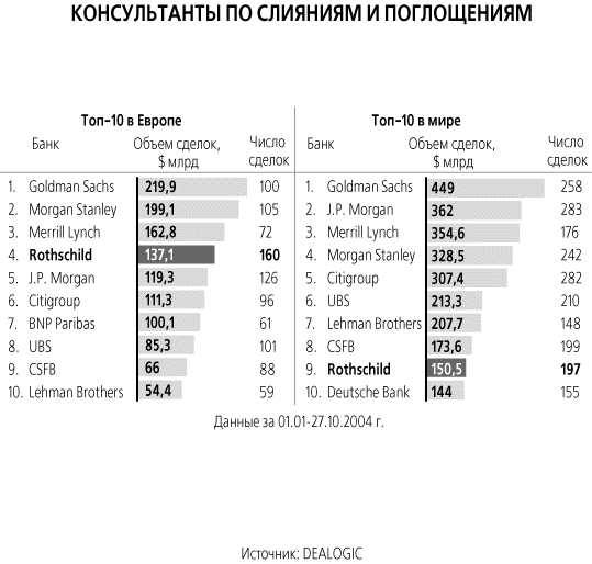 Больше не значит лучше для банкиров РотшильдовДжо Райтон В эпоху банковских монстров частному банку Дома Ротшильдов удается процветать, несмотря на относительно небольшие размеры. Однако вскоре он может остаться единственным частным инвестиционным банком, работающим на глобальном рынке. Косультанты по слияниям и поглощениям(Открывается в новом окне) По данным с начала года, Rothschild занял 4-е место в Европе среди консультантов по слияниям и поглощениям, организовав сделки на $137,1 млрд и обойдя американских гигантов Citigroup и J. P. Morgan Chase. В мире он занял 9-е место со $150,5 млрд (см. график). Барон Давид де Ротшильд, председатель совета директоров французского подразделения и главный акционер семейной бизнес-империи, уверен, что банк сможет удержать лидирующие позиции, т. к. главный его товар связи и умение находить выход из трудной ситуации. Клиенты также могут быть уверены, что необходимость достижения квартальных показателей по прибыли не будет иметь для банка приоритетного значения по сравнению с их долгосрочными интересами, говорит барон. Он отвергает идею проведения первичного размещения акций (IPO): Наша бизнес-модель быть доверенным советником в течение долгого времени, и ее лучше реализовывать в частном банке. По оценкам аналитиков, крупнейший частный инвестиционный банк Lazard примерно на треть больше по размеру, чем Rothschild. Сейчас Lazard готовится к IPO, по итогам которого его рыночная капитализация может составить $3,2 млрд. Если Lazard выйдет на рынок, Rothschild станет крупнейшим частным инвестбанком. Однако размер его акционерного капитала 1 млрд евро ($1,28 млрд) и доход, составивший в 2003 г. 828 млн евро ($1,06 млрд), меркнут по сравнению с показателями ведущих публичных банков с Уолл-стрит: доход Goldman Sachs в 2003 г. составил $16 млрд, Morgan Stanley $21 млрд, Citigroup $77 млрд. Наблюдатели не уверены, что Rothschild сможет выстоять в битве с гигантами. По мнению Мэтью Чеплиевича, банковского аналитика HSBC, Rothschild получает определенную добавленную стоимость, оставаясь независимым банком, в то время как другие становятся публичными. Однако крупные универсальные банки могут вторгнуться в его вотчину консультаций по слияниям и поглощениям, например, приманивая клиентов выгодными кредитами. Rothschild похож на последнего из могикан. Я начинаю сомневаться, сможет ли он эффективно работать без доступа к рынку капитала, говорит бывший топ-менеджер банка. По его мнению, IPO позволило бы Rothschild укрепить свое финансовое положение и привлечь известных банкиров, предложив им опционы на акции. Ротшильд не согласен на IPO, но предпринимает шаги для реорганизации семейной империи. В 1766 г. владелец меняльной конторы во Франкфурте Майер Амшель Ротшильд основал банк, начав выдавать кредиты своим клиентам. Бизнес процветал, и Майер Амшель послал четырех своих сыновей в Лондон, Париж, Вену и Неаполь, чтобы они открыли там отделения банка. Наиболее известными и успешными стали отделения в Лондоне и Париже. С начала XIX в., когда лондонский банк тайно переправлял золотые монеты через Ла-Манш, чтобы финансировать военную кампанию герцога Веллингтона против Наполеона, до Первой мировой войны Дом Ротшильдов был крупнейшей банковской группой в мире. С тех пор его влияние снижалось, поскольку другие крупные банки начали захватывать рынок. Смертельный удар по парижскому банку Ротшильдов нанесло в 1982 г. соци