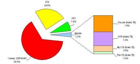 ПРИМЕЧАНИЕ: Расходы на размещение рекламы приводятся в соответствии с прайс-листами без учета скидок. В разрезе телекомпаний основные объемы рекламы шоколадной продукции пришлись на телеканал 1 канал ЕВРАЗИЯ - 64,6% от общего бюджета по данной группе (см. Диаграмму 1). На втором месте находится телеканал КТК (24,6%) и на третьем - телеканал НТК (7,4%). Реклама шоколада размещается также на кабельных телеканалах, представляемых компанией "Алма ТВ": Россия, НТВ, Муз ТВ и Рен ТВ. Однако, суммарная доля этих каналов в общем рекламном бюджете невелика - всего 3,3%. Диаграмма 1 - Распределение рекламных бюджетов по телекомпаниям, январь - сентябрь 2004г. ПРИМЕЧАНИЕ: Расходы на размещение рекламы приводятся в соответствии с прайс-листами без учета скидок.