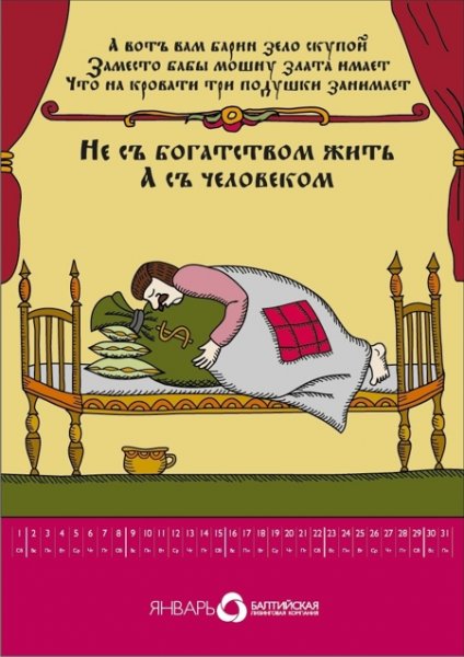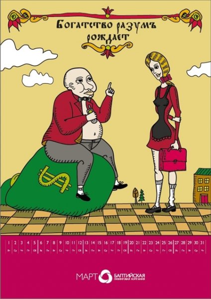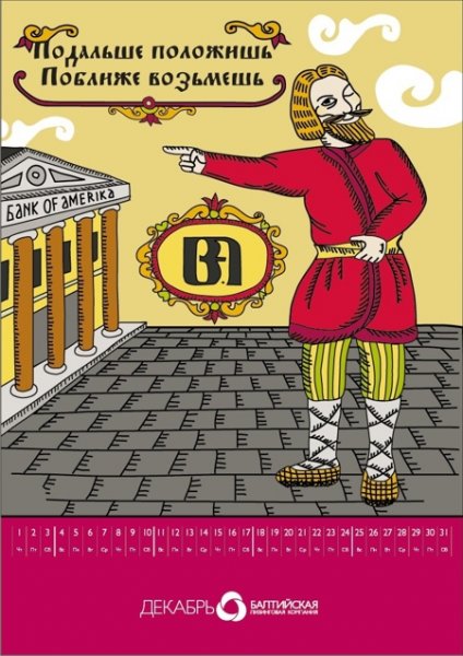 Коллекция поговорок русского народа в картинках от Балтийской Лизинговой КомпанииДизайн-студией рекламного агентства Zero Headline Advertising реализована креативная концепция имиджевого календаря "Русские и Деньги" для "Балтийской Лизинговой Компании". "Как русское шапкозакидательство или русская наивность, русские деньги - часть народной культуры, русского менталитета. Деньги на Руси всегда были категорией образующей, полярной, мерой приложения Добра и Зла. В отношении к деньгам проявляется противоречие, исконно живущее в русском характере. Звон монеты в кармане размыкал засовы и уста и помогал удачно соединить узы. А философские взгляды на мир обычно лучше всего получались через дыру в кармане. Деньги манили и отталкивали, заставляли мучительно размышлять или терять разум. Все это не прошло мимо, а осело, воплотилось в народном опыте, мудрости и глупости. Сами деньги - настолько заметное явление в жизни, что различные аспекты отношения к ним и коммуникаций с ними сформировали целый пласт культуры, народного творчества. Zero Headline Advertising собрало коллекцию вековых поговорок, из которых можно сложить наглядную мозаику многозначительного и неоднозначного отношения русского человека к деньгам." В соответствии с концепцией, на каждой полосе календаря располагается высказывание в виде пословицы/ поговорки, фиксирующее отношение русского человека к "Деньгам", "Денежному долгу", а также к "Товарно-денежным отношениям" вообще. Zero предлагает посмотреть на деньги как на культурный феномен с мощной регулирующей социальной функцией. Для пущей органичности и доказательности (опыт населения 6-й части суши) высказывания сопровождаются иллюстрациями, стилизованными под эстетику так называемого "лубка" (русского народного). Сюжеты иллюстраций раскрывают драматургию обстоятельств и/или отношений, описываемых в высказывании. По мнению разработчиков, реализация подобного проекта позволяет использовать его для устойчивых и регулярных коммуникаций. Например, возможно издание и ежемесячное распространение по базе данных клиентов или среди подписчиков деловых изданий открыток, воспроизводящих сюжеты календаря. Таким образом, у аудитории (важно, чтобы она была постоянной) возникнет позыв к коллекционированию этих открыток, так как они не являются оголтелой и назойливой рекламой, а напротив, представляют собой самостоятельную культурную ценность. Используемые поговорки: Без копейки рубля не бывает. Ближняя копеечка дороже дальнего рубля. Богатство разум рождает. За свой грош везде хорош. Не с богатством жить, а с человеком. Подальше положишь, поближе возьмешь. С сильным не борись, а с богатым не судись. Что взято, то свято. С паршивой овцы хоть шерсти клок. Только курочка от себя гребет. У всякого плута свой расчет. Что силой взято, то не свято. ![]() ![]() ![]() ![]() ![]() ![]() |