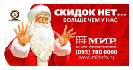 МИР: скидок нет…В преддверии Нового года компания МИР снижает цены на товары на 30проц. и проводит широкомасштабную рекламную кампанию. На телевидении кампания проходит на каналах MTV, RenTV и ТНТ. В наружной рекламе по Москве размещено 200 поверхностей + регионы. Пресса: 7 дней, TV7, Антенна, Комсомольская правда. Радио ролик размещен на Европа +, Авторадио, Серебряный дождь и Радио 7. Исполнитель: агентство Creolab Наружка /Принт Креативный Директор - Константин Максимов Копирайтер - Павел Шумов Дизайнер - Алексей Кагало Иллюстратор - Евгений Шмидт ![]() Телевизионный ролик Продакшн - PS TVC Продюссер - Наталья Коткова Режиссер - Владилен Разгулин Оператор - Алексей Молчанов Радио ролик Креативный Директор - Константин Максимов Копирайтер - Павел Шумов |
