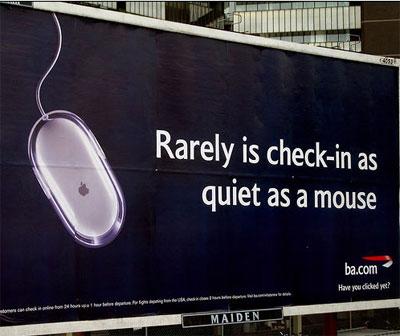В Великобритании British Airlines рекламируется вместе с Apple Computer. В Великобритании появился биллборд British Airlines со слоганом «Rarely is check-in as quiet as a mouse» (Не так часто регистрация также спокойна, как мышка). Имеется ввиду услуга заказа билетов на полет с помощью вебсайта компании British Airlines. Постер интересен также тем, что это ко-маркетинговая (co-marketing) кампания вместе Apple Computer. Именно фирменная мышка Aplpe со знаменитым логотипом изображена на постере.// AdMe.ru media-online.ru |