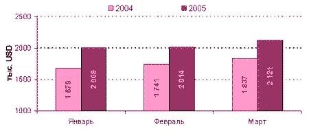 Диаграмма 2. Сравнительная динамика изменений количества выходов реклам по месяцам, I квартал 2004, 2005 гг.