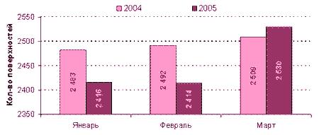 В I квартале 2005 года рекламу своих товаров и услуг на улицах нашего города разместили 365 рекламодателей, заняв в общей сложности 7 360 поверхностей (сумма по месяцам). Количество рекламных поверхностей в I квартале 2005 года в сравнении с аналогичным периодом 2004 года уменьшилось на 1,7%.