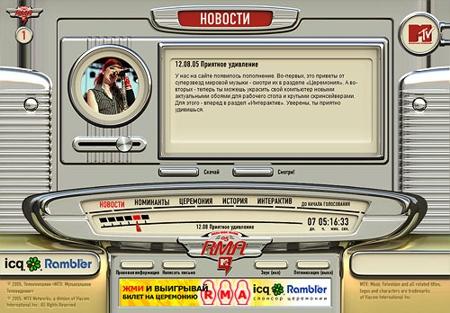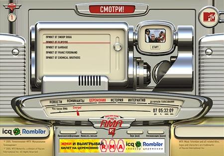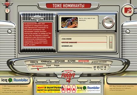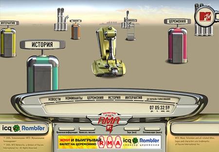 Студия Park выполнила работу для сайта российского MTVРабота приурочена к проведению Russian Music Awards - 2005 (http://rma.mtv.ru/). Занятная вариация на тему футуристического безвременья, с роботом-манипулятуром в главной роли. Действие происходит на фоне рассвета новой эры, на поверхности голой планеты, заставленной некими объктами - "станциями" - являющимися в свою очередь объектами интереса робота-манипулятора, который, заполучив в свое щупальце ключ-матрешку, перемещается в пространстве, управляемый посетителем сайта, от "станции" к "станции", контактирует с ними посредством ключа и выявляет тем самым интересующую нас информацию. Процесс манипуляций выдержан в популярном стиле технологической антиутопии, иллюстрирующей общее настроение современного человека. ![]() ![]() ![]() ![]() ![]() ![]() ![]() ![]() ![]() |