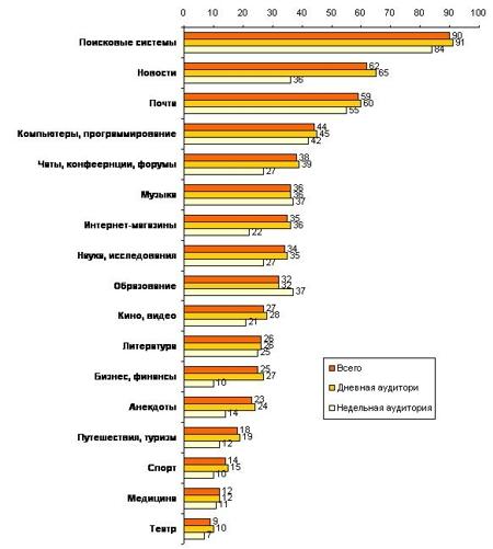 ROMIR Monitoring узнал о любимых сайтах интернетчиковВ ходе ежеквартального мониторинга российской интернет-аудитории исследовательский холдинг ROMIR Monitoring попросил активных интернетчиков назвать наиболее посещаемые ими сайты. Итак, на первом месте с 90% голосов участников опроса оказались поисковые системы. 62% интернет-пользователей регулярно посещают новостные сайты, а 59% - почтовые. Сайты какой тематики Вы посещали за последний месяц чаще всего? Возможно несколько ответов (%) ![]() Стоит заметить, что представители дневной аудитории, как правило, посещают не только наиболее популярные поисковые, новостные или почтовые сайты, но и добираются до специализированных сайтов, посвященных медицине или театру. А вот предпочтения недельной аудитории выглядят несколько иначе. Интернетчики, заходящие в Сеть пару раз в неделю, значительно реже читают новости, участвуют в форумах и чатах, посещают интернет-магазины. Единственный показатель, по которому они обгоняются ежедневных интернетчиков - это образовательные сайты. Женщины реже, чем мужчины посещают сайты посвященные компьютерам и программированию и новостные сайты. Однако среди представительниц прекрасной половины более популярны почтовые сервера, а также сайты посвященные образованию и туризму. Пользователи интернет средней и старшей возрастной групп (от 25 лет) чаще, чем более молодые интернетчики, посещают новостные сайты, сайты интернет-магазинов, а также сайты, посвященные бизнесу и финансам. В молодой (до 25 лет) аудитории большей популярностью пользуются сайты, посвященные компьютерам и программированию, музыке, а также сайты о кино и видео. Исследование предпочтений интернет-аудитории на предмет тематики наиболее часто посещаемых сайтов также позволило составить портреты среднестатистического пользователя тех или иных сайтов. Вот как выглядит, например, классический пользователь поисковых систем. 90% пользователей поисковыми системами заходят в Сеть как минимум раз день (дневная аудитория). Две трети пользователей поисковиками -мужчины, а треть - соответственно, женщины. Значительную долю пользователей поисковыми системами составляют интернетчики в возрасте от 18 до 34 лет. Две трети пользователей поисковыми системами являются предпринимателями, руководителями либо квалифицированными специалистами. Еще 21% таких пользователей - это студенты и учащиеся. Портрет посетителей новостных сайтов во многом схож с характерными чертами заядлого пользователя поисковиками. Это опять на 90% представители суточной аудитории, две трети из которых мужчины, а треть женщины. 80% читателей новостных сайтов - это интернетчики в возрасте от 18 до 34 лет. Однако среди поклонников новостных сайтов совсем нет подростков 14-17 лет. Также среди посетителей новостных сайтов незначительную долю составляют рабочие - 9%. Почти 70% интернетчиков, посещающих новостные сайты - это квалифицированные специалисты или предприниматели, больше половины которых имеют высшее образование. Данные были получены в рамках онлайн-омнибуса, в котором приняли участие 3650 респондентов, активных интернет-пользователей со всей России, в возрасте от 14 лет и старше. |