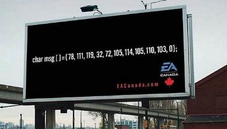 Новые методы конкурентной борьбы в КанадеТакой рекламный щит появился перед зданием конкурентов компании Electronic Arts. Собственно это - узконаправленная целевая реклама, непонятная случайным прохожим. Надпись в коде ASCII гласит "Мы нанимаем!". Креатив от TBWA Ванкувер. ![]() |