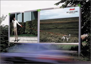 Такие "двойные" щиты разработаны агентством Scholz & Friends из Гамбурга для рекламы собачьего поводка. Слоган этой рекламной кампании - "Действительно длинный".