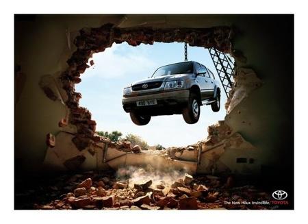 Эта идея воплощена в рекламе автомобиля Hilux от Saatchi&Saatchi (Великобритания). Если уж машина может использоваться как ядро для пробивания стен, то пассажирам внутри салона точно ничего не угрожает.
