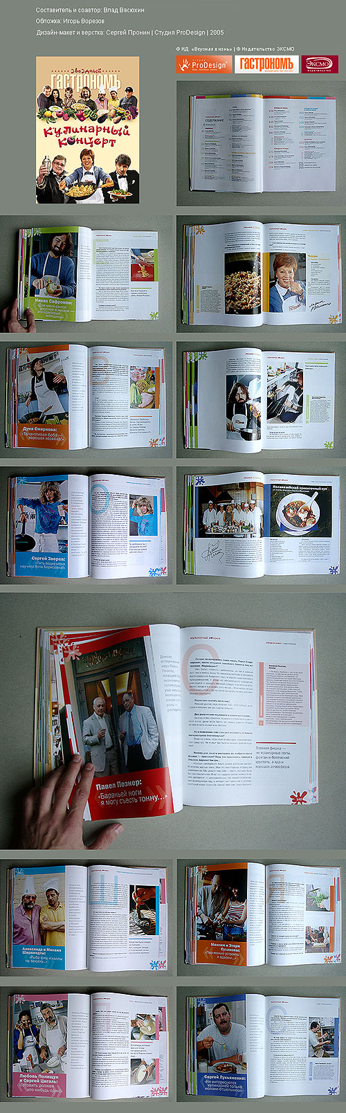Васюхин, Пронин, Логвин и Ко устроили «Кулинарный концерт»В конце ноября в крупнейшем российском издательстве «Эксмо» вышла в свет первая книга из серии «Звездный гастроном» – «Кулинарный концерт. Разговоры и рецепты». ![]() К этому подарочному изданию оказались причастны люди, хорошо известные в рекламных кругах страны – журналист и копирайтер Влад Васюхин (автор идеи, составитель, соавтор), дизайнеры Сергей Пронин (макет, верстка) и Андрей Логвин (один из героев). В богато иллюстрированную книгу вошли интервью с известнейшими российскими деятелями культуры, спорта и шоу-бизнеса. Действующие лица – от Романа Виктюка, Евгения Миронова, Геннадия Хазанова, Максима Суханова и Ларисы Латыниной до Сергея Зверева, Алены Апиной, Бориса Моисеева и Никаса Сафронова. Все разговоры посвящены гастрономическим пристрастиям и кулинарному опыту «звезд», и ранее (с ноября 2001 года) эти тексты были опубликованы в «Гастрономе», ведущем российском журнале «для тех, кто ест». Влад Васюхин, является не только составителем «Кулинарного концерта», но и автором большинства интервью, в том числе с лауреатом Государственной премии России выдающимся дизайнером Андреем Логвиным, который представил в книге рецепт своего легендарного борща. Влад же привлек к работе над книгой Сергея Пронина (студия ProDesign), с которым его уже несколько лет связывает творческое сотрудничество. «Сергей подключился к проекту, когда мы были вынуждены отказаться от услуг другого дизайнера, сорвавшего все сроки. И, несмотря на жесткие временные рамки, Пронин сделал свою работу быстро, хорошо и без истерики» – уверяет составитель книги. ![]() В предисловии к сборнику Влад Васюхин пишет: «Кумир в роли кулинара?! Телевидение уже приучило нас к этому зрелищу. Мы убедились, что у людей искусства «все, как у людей», что они вполне уверенно чувствуют себя на кухне и даже на необитаемом острове не умрут с голода. Одна из героинь этой книги, Юлия Меньшова, заметила по поводу готовки: «В этом деле нет никакой зависимости от профессии. Есть даже плюс: если к еде относиться как к творчеству, то люди творческих профессий готовят потрясающе». С ней солидарна и другая наша собеседница – Дуня Смирнова: «Талантливая баба будет обязательно хорошо готовить! Ведь талантливый человек жизнелюбив, а жизнелюбие подразумевает соприкосновение с плотским миром. При новом знакомстве я всегда ненароком интересуюсь: «А ты любишь готовить?» И если любит, то это хороший человек…» Следуя этой логике, можно смело утверждать, что мы собрали под одной обложкой хорошую компанию хороших людей. И хотя эта книга не является классическим кулинарным пособием, по этим рецептам, заявляю как очевидец, можно смело готовить. Проверено! А эти разговоры, надеемся, доставят вам не меньше удовольствия, чем дегустация звездной кухни». Несмотря на то, что книга появилась на прилавках совсем недавно и стоит довольно прилично (от 320 до 470 рублей), она уже успела попасть в списки бестселлеров: первый тираж (10 000 экземпляров) был раскуплен оптовиками еще до выхода в свет, через несколько дней должен выйти дополнительный тираж. Сегодня «Кулинарный концерт» представлен в большинстве книжных магазинов Москвы, Санкт-Петербурга и других городов, а также в главных Интернет-магазинах, включая ozon, bolero и т.д. Как рассказал Sostav.ru составитель, вскор