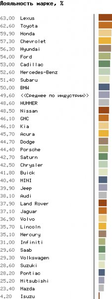 Любовь до гроба. Американская компания J.D. Power and Associates составила рейтинг марок по степени лояльности покупателейКирилл Тищенко Американская компания J.D. Power and Associates составила рейтинг марок по степени лояльности покупателей. На первые места вышли японские автомобили, но и армия преданных поклонников Chevy и Caddy пока не уменьшается. Американская компания J.D. Power and Associates, предоставляющая услуги в области анализа рынка и маркетинга, опубликовала данные ежегодного исследования Customer Retention Study. Исследование проводится в третий раз и посвящено тому, какой процент автовладельцев при смене автомобиля не изменяют марке и выбирают ту же модель или другую, но из линейки того же производителя. Выяснилось, что на лояльность потребителей определенной марке влияют не только качество автомобиля или сервисного обслуживания. Одна из наиболее важных причин, по которым автовладельцы обращают внимание на продукцию другого производителя, – отсутствие машины с нужным типом кузова в модельном ряду компании. Как отмечают аналитики J.D. Power and Associates, производители в большинстве своем не питают надежд, что покупатель будет пользоваться их автомобилями на протяжении всей жизни. Тем не менее многие часто путем приобретения других марок или брэнд-инжиниринга сумели создать достаточное портфолио моделей, позволяющих удерживать покупателя по мере роста его доходов и требований. Среди потребителей, соблазненных другими марками, почти две трети приобретают новый автомобиль исходя из практических нужд. Более трети выбирают другой брэнд за более качественные, по их мнению, автомобили или поддавшись обаянию более эффектного дизайна. В 2003 году, когда лояльность американских автовладельцев изучили впервые, в списке производителей лидировал Chevrolet. Среди моделей, которые помогали сформировать лояльность покупателя к марке, аналитики отметили пикап Avalanche – 74,5% его бывших владельцев снова делали выбор в пользу Chevrolet, TrailBlazer – 73,8%, Impala – 70,1% и Silverado 1500/2500 – 68,7%. В прошлом году наиболее лояльными были признаны покупатели Toyota. Самыми преданными японской марке оказались владельцы моделей Camry (64,8% приобрели ее снова или сменили на другую модель Toyota), Corolla (64,5%), Sienna (68,6%), Highlander (68,4%) и Tundra (64,8%). В 2005 году, по результатам опроса, 177 941 покупателей новых машин на первое место по лояльности вышел Lexus – люксовый брэнд Toyota. Предлагающая более доступные модели Toyota опустилась на второе место. В первый раз из тройки чемпионов по лояльности покупателей выбыл Chevrolet. В целом же десятка марок, снискавших преданность американских автовладельцев, практически не изменилась с 2003 года: в нее входят Toyota, Lexus, Chevrolet, Honda, Ford, Subaru, Mercedes-Benz, Cadillac, Hyundai, BMW. Toyota и Honda не только успешно сохраняют своих покупателей, но и отбивают их у других производителей. На каждого покупателя, расставшегося с Toyota, приходится шесть пришедших от других марок, у Honda этот показатель составляет 1:4. В то же время Subaru удается сохранять достаточно высокий уровень лояльности среди своих покупателей, но чужих покупателей у японской компании соблазнить не получается: от Subaru пока чаще уходят, чем приходят. В текущем году эксперты J.D. Power and Associates отметили также Suzuki и Acura. Первому производителю удалось улучшить свои показатели с 2003 года на 38%, Acura – на 25%. «Suzuki гигантскими шагами идет к сохранению своих клиентов – частично благодаря расширени