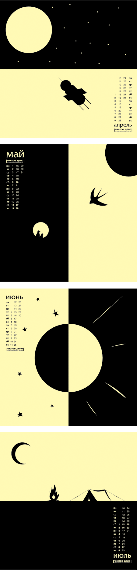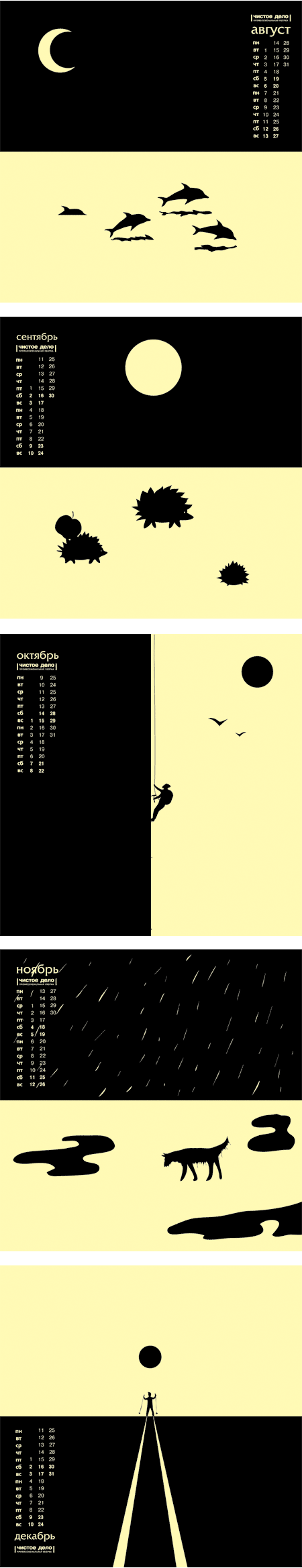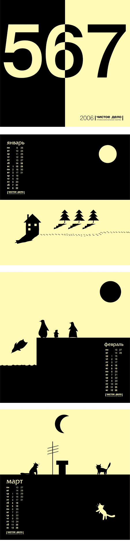 Креативная лаборатория "Креон" (Тольятти) разработала корпоративный новогодний календарь для клининговой компании "Чистое дело"Известно, что под Новый год руководителей компаний атакуют килограммами и тоннами фирменных календарей от партнеров с рекламой их продукции и услуг. Какая участь их ожидает? В обычном случае - нижний ящик письменного стола. Компания "Чистое дело" не только за чистые полы и стены, но и за чистоту мысли. Главным достоинством получившегося календаря стали чистые и душевные иллюстрации, выполненные в двухцветной гамме. Для каждого месяца созданы свои яркие и очень лаконичные образы, которые отражают все прелести конкретного месяца. Промокшая насквозь собака ноября или тени, отбрасываемые елками января, могут сказать гораздо больше, чем любые слова. Главное - ощущение чистоты и минимализма. Вот такие чистые дела. Дизайн и идея: Кирилл Мясищев ![]() ![]() ![]() |