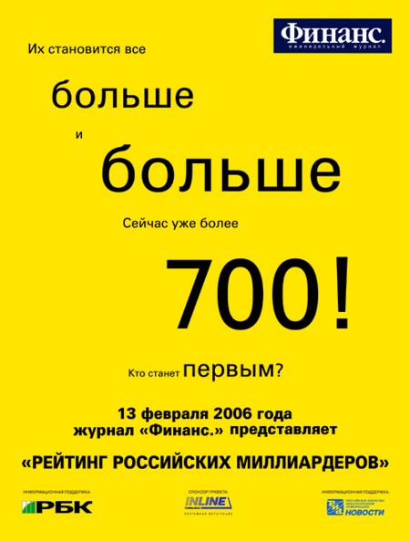 Журнал "Финанс." начинает рекламную кампанию специального проекта "Рейтинг Российских миллиардеров -2006", который выйдет 13 февраляАнонсирующие макеты рейтинга будут размещены в журналах "Главбух", "Документы и Комментарии", "Двойная запись", "Кадровое дело" и Sales. Кроме того, с 23 января по 13 февраля на телеканале РБК будет запущен 15-секундный анонсирующий ролик. Ролик сделан компанией "Бигфут". ![]() |