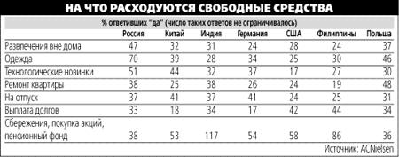 Shopping по-русски. Российские потребители научились жить на широкую ногуБорис ГрозовскийРоссийские потребители научились жить на широкую ногу в сравнении с жителями других стран они много развлекаются, падки на технические новинки и не любят копить деньги, выяснили маркетинговые агентства ACNielsen и GfK. Опрошенные ACNielsen россияне на удивление уверены в будущем: 67% полагают, что на протяжении ближайших 12 месяцев состояние их финансов останется отличным или хорошим. В Китае, Португалии, Южной Корее и Японии таких всего 21-31%, на Тайване и во Франции 39-40%. Всего 5% опрошенных россиян сообщили ACNielsen, что после оплаты самых необходимых и насущных расходов (без учета погашения долгов) у них ни на что не остается денег. В США и Португалии таких по 22%, а в Британии, Канаде, Нидерландах и Франции по 15-19%. Из 42 стран лишь в Индонезии, Испании и Таиланде оказалось меньше бедных интернет-пользователей, чем в России. Свободными деньгами россияне тоже распоряжаются совсем не так, как потребители других стран (см. таблицу). По готовности потратить средства на одежду и технологические новинки Россия обогнала все опрошенные ACNielsen страны мира (70%). Конкуренты далеко позади: одежду покупают 45-47% интернет-пользователей из Бразилии и Италии и только 25% из США. Нет равных россиянам и в покупках новых технологических устройств: в России модников 51%, а в Китае, Таиланде и Турции по 43-44%. Но замгендиректора ММВБ Валерий Петров указывает на то, что аудитория Интернета это относительно немногочисленный круг хорошо обеспеченных молодых людей, поэтому результаты опроса нехарактерны для России в целом. далее...![]() Ведомости |