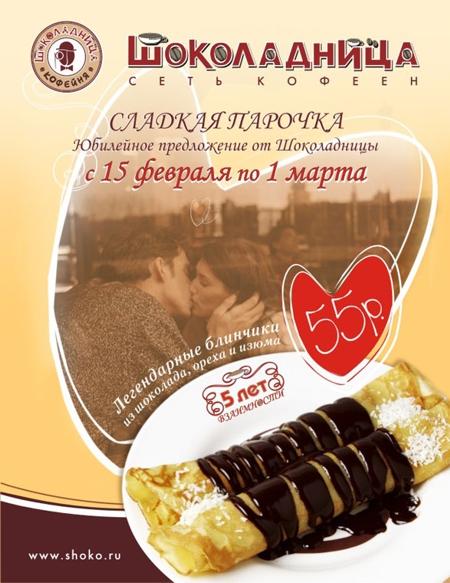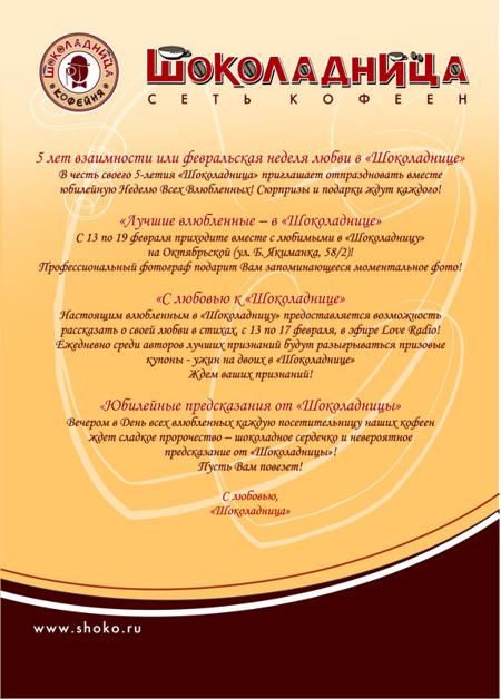 13 февраля началась рекламная кампания акции, которую проводит сеть кофеен "Шоколадница" в честь своего 5-летияРазмещение анонса акции проходит: в столичных глянцевых журналах, на Love Radio (с 13 по 17 февраля) и на рекламных перетяжках. Распространяются также открытки Fly Card и анонсируется в интернете. Состав творческой группы: Креатив: агентство Imageland Public Relations Дизайн: агентство "Фора медиа сервис" Директор по маркетингу сети кофеен шоколадница: Зайцева Ирина ![]() ![]() ![]() ![]() ![]() ![]() ![]() |