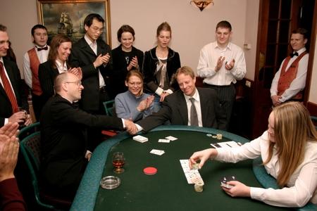 8 и 9 февраля в сигарном клубе "Граф Орлов" сайт EuroPoker.com провел турниры по покеру, участниками которых стали избранные персоны Москвы и представители средств массовой информацииПобедителем турнира Europoker VIP 2006 стал лидер группы "СерьГа" - Сергей Галанин. Надо отметить, что Сергей играл в покер этим вечером впервые, как и подавляющее число остальных участников: организаторы турнира предоставили гостям возможность освоить азы игры на специальных учебных столах непосредственно перед началом турнира. Сергей Галанин: "Игра захватывающая и, как ни странно, интеллектуальная, хотя раньше я так не думал. Чтобы хорошо играть, нужно быть тактиком и стратегом одновременно, иметь крепкие нервы и уметь ждать своего момента начала наступления на противника. Так как играл не на свои деньги, а на фишки, то испытал весь спектр от маленькой радости до полного восторга!" На следующий день за игровыми столами встретились представители СМИ. Акул пера настолько увлекла игра, что для выбывших участников был организован утешительный игровой стол, на котором победу одержал корреспондент журнала "Профиль" Владимир Шевченко, так и не уступив в напряженной борьбе своей сопернице из Harper's Bazar Елизавете Воскресенской. Ну а победителем основного турнира Europoker Media 2006 стал Карл Норманн (специальный гость турнира), второе место занял директор российского бюро информационного агентства "Доу Джонс" Джеффри Смит, бронза досталась представителю журнала "Досуг и развлечения" Льву Артамонову. Первой среди представительниц прекрасного пола стала Виктория Инкелес из Sostav.ru, занявшая четвертое место. Несмотря на то, что турниры Europoker были организованы как светские мероприятия, и игра была не на деньги, накал страстей и соперничество полностью соответствовали профессиональным покерным чемпионатам. Покер - это игра, успех в которой в равной степени зависит от психологии, мастерства и памяти игрока, это поле напряженного соперничества, где острый ум, нервы и навыки решают все, и именно это хотели продемонстрировать организаторы турнира. ![]() ![]() ![]() ![]() ![]() ![]() ![]() ![]() ![]() ![]() ![]() |