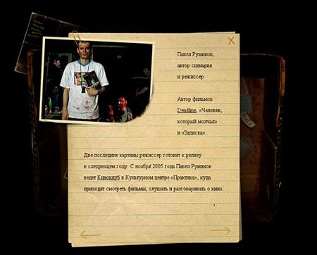 Студия Nimbler разработала сайт фильма Павла Руминова "Мертвые дочери"Cтудия Nimbler завершила работы над промо-сайтом фильма "Мертвые дочери" http://www.ddmovie.ru/. Первый отечественный джей-хоррор выйдет в прокат летом 2006 года. Сайт передает мистическое настроение фильма, атмосфера поддерживается звуками из саундтрека. Сайт-загадка, со своими секретами, спрятанными страницами, с "разделом для призраков", который навряд ли поймет простой смертный, и с загадочной коробкой, в которой можно найти кучу всякого барахла: от рисунков дочерей до интервью с режиссером фильма. На сайте можно скачать ролики с материалами будущего фильма и фрагменты сценария. Фильм снимается кинокомпанией Praktika Pictures по заказу Central Partnership, режиссер и автор сценария Павел Руминов. Состав творческой группы: Арт-директор и дизайнер - Антон Гладкобородов Дизайнер - Александр Сергиевский Флешер - Игорь Киселев Технологи - Игорь Гладкобородов и Иван Кучин Менеджер - Александр Похвалин ![]() ![]() ![]() ![]() ![]() ![]() |