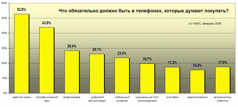 КМИС установил, какие телефоны будут покупать на Украине в 2006 годуСогласно исследованию, проведенному консалтинговым департаментом Киевского международного института социологии - КМИС (в феврале опрошено 2014 человек по всеукраинской выборке, репрезентативной для населения Украины не моложе 18 лет), мобильные телефоны имеют 44,4% человек. 9,8% при этом думают о приобретении нового мобильного телефона в текущем году. Всего же 18,5% человек думают о приобретении мобильного телефона в текущем году. Из тех, кто думает покупать мобильный телефон, для 52,8% обязательным является наличие в нем цветного экрана, для 43,8% - полифонического звука, для 28,4% - видеокамеры, для 26,1% - цифрового фотоаппарата, для 23,6% - мобильного интернета, для 19,7% - музыкального мп3-проигрывателя, для 17,3% - диктофона, и для 15,4% - радиоприемника. Затруднились ответить что для них является обязательным в планируемом к покупке телефоне 17,6% человек. Схема 1