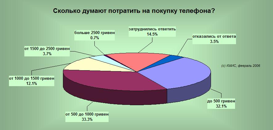 (Открывается в новом окне) 32,1% планируют потратить до 500 гривен на покупку мобильного телефона, 33,3% - от 500 до 1000 гривен, 12,1% - от 1000 до 1500 гривен, 3,7% - от 1500 до 2500 гривен, и 0,7% - более чем 2500 гривен. 14,5% затруднились ответить, и 3,5% отказались от ответа на данный вопрос. Схема 2
