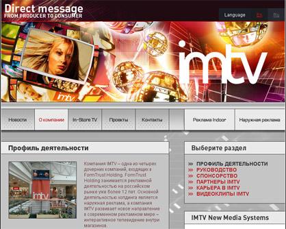 "Студия Валерия Комягина" разработала сайт компании IMTVКак стало известно Sostav.ru, компания IMTV, впервые предложившая отечественному рынку услуги телевизионной рекламы на местах продаж, доверила разработку и создание своего веб-сайта Студии Валерия Комягина. Выдержанный в hi-tech-стиле, наиболее ярко отразившем динамичность и суперсовременность Instore TV-технологий, сайт www.imtv.ru состоит из многочисленных мультимедиа-компонентов: интродукционного splash-ролика, flash-представлений на каждой странице сайта, придающих эффект телевизионного присутствия и т.д. При этом тематика сайта охватывает не только такую новейшую область рекламного рынка, как Instore TV, но и описывает еще одну сферу деятельности холдинга FormTrust, куда входит компания IMTV - наружную рекламу. ![]() |
