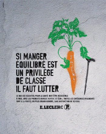 Сеть французских гипермаркетов E.Leclerc приводит доводы в пользу сбалансированного питания для всехНачиная с 10 апреля сеть французских гипермаркетов Э.Леклерк возвращается в рекламу с новой кампанией, созданной независимым французским рекламным агентством Australie, и вновь активно декларирует: доступ к сбалансированному питанию для всех потребителей. С помощью некоторых своих марок - Eco + и Marque Rep?re - дистрибьютор действительно борется за свою идею - вопрос сбалансированного питания никогда не должен быть денежным вопросом и даже самые скромные семьи должны иметь возможность так питаться, сообщает toutsurlacom.com. Кампания, предусмотренная в печати, строится на трех образах и представляет товары широкого потребления (рыба в цилиндре, морковь с тростью и кисть винограда в корсете), нарисованные на стене в необычном виде, выступая против идеи о том, что сбалансированное питание - привилегия богатых, с подписью: "Если сбалансированное питание - привилегия класса, то надо с этим бороться" (Si manger ?qulibr? est un privil?ge de classe, il faut lutter). ![]() |