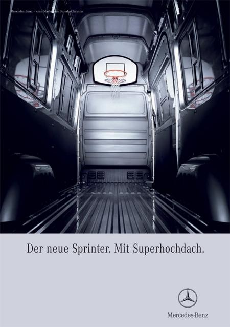 Новый Sprinter - где еще поиграть в баскетбол?Этот плакат - часть рекламной кампании для Mercedes Sprinter. Новая кампания для этого автомобиля, подготовленная агентством BBDO Берлин, показывает его достоинства - например, этот плакат демонстрирует его вместительность. Рекламная кампания проводится в прессе, в интернете, на телевидении и т.д. Ее задача показать, что новый sprinter стал еще более удобным и комфортным и прекрасно справляется со всеми задачами. Заказчик рекламной кампании - DaimlerChrysler. Кампания, которая включает в себя и 5-минутный фильм подробно рассказывающий обо всех достоинствах Mercedes Sprinter уже стартовала в Германии и скоро выйдет в других странах Европы. ![]() |