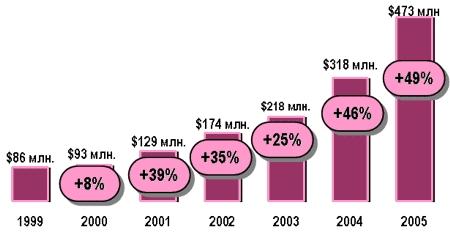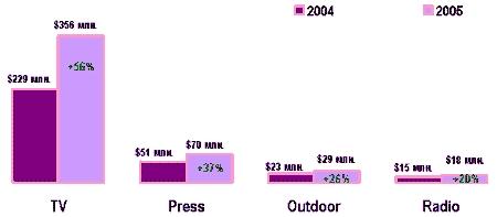 Объемы казахстанского рынка рекламы по медианосителям, январь-декабрь 2005 годаЗа последние несколько лет рынок рекламы значительно увеличил свои обороты. Наиболее значимый рост суммарных объемов рекламы по всем медианосителям наблюдался в прошедшем 2005 году - 49%. Рекламный бюджет составил практически $473 млн., по сравнению с $318 млн. в 2004 году. Диаграмма 1. Динамика изменений суммарных объемов рекламы (ТВ, пресса, радио, наружная реклама) Примечание: расходы на размещение рекламы приводятся в соответствии с прайс-листами без учета скидок. Казахстанский рынок рекламы продемонстрировал рост объемов рекламы по всем типам медианосителей. (см. Диаграмму 2). Так показатель годового рекламного бюджета на телевидении составил $356 млн., что на 56% выше показателя 2004 года. При анализе рекламного бюджета в прессе в 2005 году также отмечается значимый рост 37%. Суммарный бюджет в прессе составил $70 млн., в 2004 году бюджет равнялся $51 млн. Объем рекламных бюджетов наружной рекламы в 2005 году вырос на 26%, по сравнению с 2004 годом, и составил $29 млн. Наименьший рост рекламных бюджетов в 2005 году отмечался у радио +20%, что составляет $18 млн., в 2004 году рекламный бюджет был равен $15 млн. Диаграмма 2. Динамика изменений суммарных объемов рекламы по медианосителям При оценке бюджетов рекламодателей, наиболее крупными за январь - декабрь 2005 года были компании PROCTER & GAMBLE, UNILEVER и COLGATE-PALMOLIVE (см. Таблицу 1). Таблица 1. Десять крупнейших рекламодателей по рекламному бюджету, январь - декабрь 2005 год