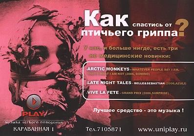 Найдено лекарство от птичьего гриппаВ плохом всегда нужно искать положительные моменты. Так и опасная болезнь стала хорошим поводом для рекламной кампании. Этот флаер привлекает внимание своей актуальностью и издалека кажется социальной рекламой. Но надежда найти толковые рекомендации по профилактике смертельной заразы напрасна: оказывается, чтобы спастись от птичьего гриппа, достаточно слушать определённую музыку... ![]() www.e-generator.ru/ |