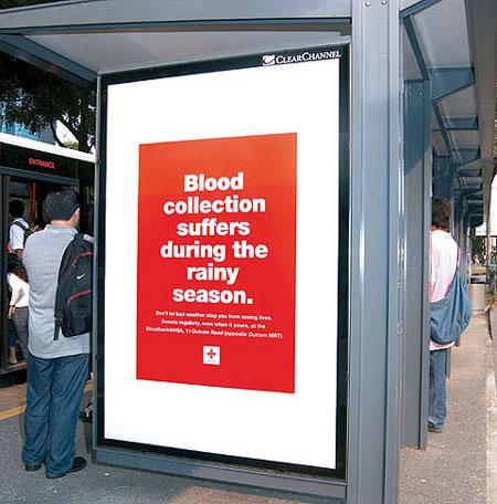 А дождь смывает кровь"Сбор (донорской) крови страдает в дождливый сезон" (Blood collection suffers during the rainy season) – слоган рекламной акции от РА Bates (Singapore). И кровь смывается дождем, и меньше жизней уже можно спасти… Не позволяйте плохой погоде останавливать Вас на пути к доброму гуманному делу! ![]() ![]() www.e-generator.ru/ |