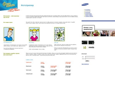 Articul Media объявляет о новом интернет-проекте "Фотомания", разработанном по заказу Samsung ElectronicsКак рассказали Sostav.ru, "Фотомания" - это не просто промо-сайт фотокамер Samsung, но и развлекательный ресурс . В основе проекта лежит анимированный он-лайн сериал "Фототриллер", развитие событий в котором, определяют сами пользователи. В Articul Media создали персонажей, которые всегда находятся в гуще событий. Поэтому с ними постоянно происходит что-нибудь интересное и смешное, а иногда даже опасное. Но дружба, хитрость, чувство юмора, страсть к фотосъемке, а главное, наличие фотоаппарата Samsung, помогают им выходить из любых ситуаций победителями. Раз в две недели анонсируется 2 варианта дальнейшего развития сюжета, из которых посетители сайта выбирают понравившийся. Сейчас вышла первая серия "Фототриллера". Герои сериала: Коля, Катя и Зум-Зум. Коля Мегапиксел Весельчак, энергичный парень в полном расцвете сил, иногда любит немного пошкодить, как все мальчишки. Ведет активный образ жизни и никогда не расстается с любимым фотоаппаратом. Катя Флеш Современная девушка, умница и красавица. В меру кокетлива, иногда обидчива, но не злопамятна. Любит свой фотоаппарат и Колю (но это пока тайна). Зум-Зум Знаток всех самых последних цифровых фототехнологий. Абсолютно зеленый, стопроцентно смешной и слегка пугливый. Обычно подсказывает ребятам правильные решения в разных ситуациях. Еще одной оригинальной составляющей сайта стал раздел "Создай свой комикс". Любой зарегистрированный пользователь может сделать собственный комикс и отправить его друзьям, для этого надо всего лишь зугрузить несколько фоток и придумать к ним смешные подписи. Разместив любимые фотографии в разделе "Фотоконкурс", можно выиграть множество полезных призов, ну и естественно прославиться. Наконец, помимо развлечений, здесь же можно приобрести фотокамеры Samsung. Состав творческой группы: Арт-директор - Егор Аристакесян Менеджмент проекта - Ольга Куликова Дизайн и макетирование - Егор Аристакесян, Михаил Танский Копирайт - Егор Аристакесян Анимация - Роман Картонов HTML код - Рустам Кузмани, Юлия Пожидаева Программинг - Александр Никишенков, Михаил Лисняк ![]() ![]() ![]() ![]() |