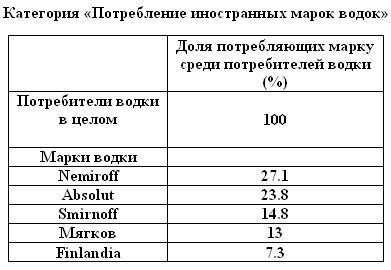 В категории «знание иностранных марок водок в России» тройка победителей осталась в том же составе, поменялись местами только лидеры. Первую строчку заняла ТМ Absolut (доля знающих марку среди потребителей водки составила 55.8%), вторую – ТМ Nemiroff (44.4%), на третьем месте – ТМ Smirnoff (37.2%).