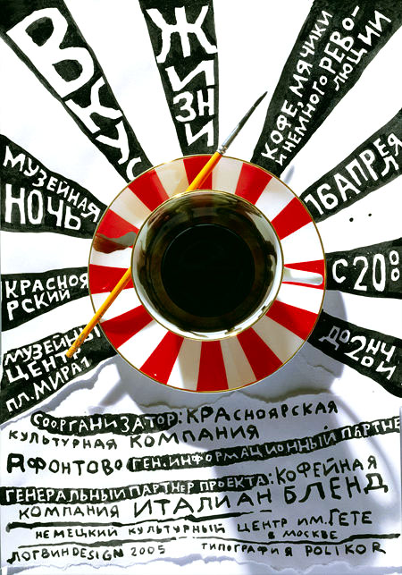 РАДОСТЬ ДНЯ. ВКУС НОЧИВ Шомоне, где только что открылся 17-й Международный фестиваль плаката, первую премию получил плакат Андрея Логвина "Вкус жизни" для "Музейной ночи" в Красноярском музейном центре. Пятнадцать лет, после первой премии, завоеванной Юрием Боксером, наши плакатисты не только не получали в Шомоне никаких наград, но и не каждый раз проходили там весьма придирчивый Отборочный комитет. Первую премию плакату Логвина присудило международное жюри в составе: Олег Векленко (Украина), Анетт Ленц (Франция), Рико Линс (Бразилия), Алиса Твемлоу (США), Сигео Фукуда (Япония). Сер. Ив. Серов Журнал "[Как)" |