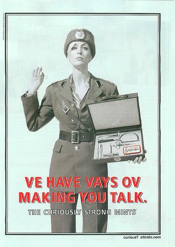 Мы развяжем тебе языкМятные пастилки фирмы Altoids от корпорации Philip Morris, производящей и упаковывающих их в универсальные металлические футляры, с рекламным слоганом "Удивительно крепкая мята" (Curiously strong mints) настолько сильны, что могут заменить собой целый пыточный набор из арсенала то ли КГБ, то ли ГРУ. Надпись на ломанном английском: "У нас есть средства, чтобы заставить тебя говорить". (Дама появилась, видимо, из кинофильма: либо из "Красной жары", либо из "Парка Горького"). Рекламой Altoids занимается Leo Burnett (Чикаго) из Publicis Groupe. ![]() www.e-generator.ru/ |