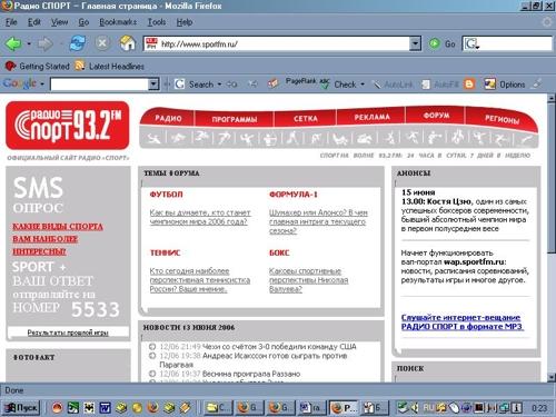 (Открывается в новом окне) На пресс-конференции "Радио Спорт" был представлен и сайт радиостанции - www.sportfm.ru, также созданный компанией 4Radio. Его отличает максимальная интерактивность, возможность оперативной связи аудитории с сотрудниками радиостанции. ![]() ![]() |