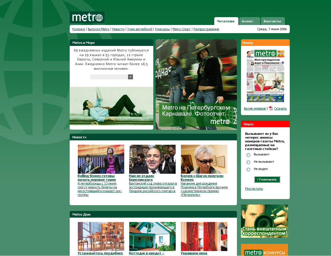 "ЮМИ студия" создала новый сайт для газеты MetroЗавершилась совместная работа интернет-агентства "ЮМИ студия" и газеты Metro www.metro-russia.com по созданию нового информационного сайта. В связи с присоединением петербургской газеты к международному концерну Metro поменялся фирменный стиль издания: он унаследовал корпоративные цвета и стандарты концерна. Редизайн сайта газеты Metro был поручен интернет-агентству свежих идей "ЮМИ студия". Основной задачей являлась разработка удобного инструмента самостоятельного управления сайтом для редакции газеты. |