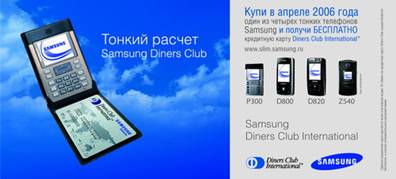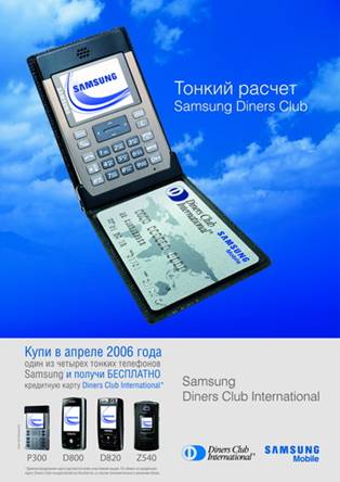 Samsung Mobile + Diners Club = «Тонкий расчет»Рекламное агентство TBD Group провело для Samsung Mobile и Diners Club акцию «Тонкий расчет»2 недели назад завершилась значительная рекламная кампания – совместный проект крупнейшего производителя мобильных телефонов Samsung Electronics и компании-изготовителя элитных пластиковых карт Diners Club.