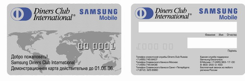 Diners Club - пластиковая карточка, позволяющая не только расплачиваться, но и пользоваться услугами элитарного международного клуба Diners Club – страховкой на крупную сумму денег, бесплатными залами ожидания в международных аэропортах и многими другими приятными вещами! Тонкий телефон, в котором умещается всё, плюс элитная пластиковая карточка Diners Club помогают своему владельцу совершать самые тонкие расчеты. Идеальный комплект для бизнесмена, привыкшего считать время и деньги, и в то же время обладающего тонким вкусом и любовью к качеству и удобству!