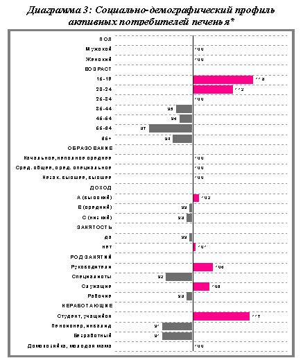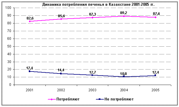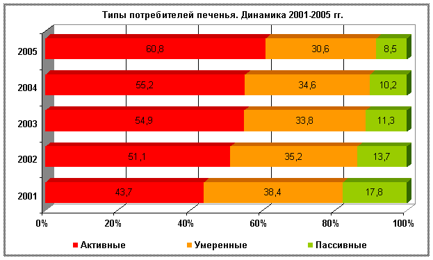(Открывается в новом окне) Также необходимо отметить, что среди потребителей значимо выросла доля активных2 потребителей печенья. Рост данной группы потребителей в 2005 году составил 39%, по сравнению с 2001 годом. Диаграмма 2