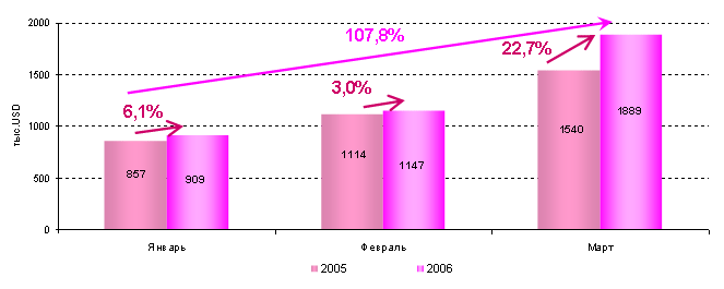 Объемы казахстанского рынка радио рекламы (I квартал 2006 года)По данным компании TNS Gallup Media Asia расходы на размещение рекламных радио роликов за первые три месяца 2006 года составили около 4 млн. USD, что на 57,1% больше, чем за аналогичный период 2005 года. Наиболее заметен рост рекламных бюджетов в марте - на 22,7%. В марте по сравнению с январем наблюдается рост рекламных бюджетов на радио на 107,8% (см.Диаграмму 1). Диаграмма 1. Динамика изменений рекламных бюджетов на радио, I квартал 2005, 2006гг.