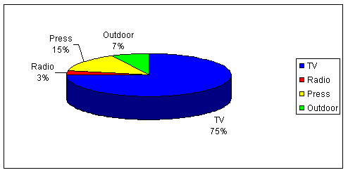 Общий рекламный бюджет по четырем типам медианосителей за I квартал 2006 года составил 118,8 млн. USD. Для сравнения: за аналогичный период 2005 года этот показатель равнялся 95,8 млн. USD. Таким образом, общий рост рекламных бюджетов на телевидении, радио, в прессе и наружной рекламе составил 24,0%. Диаграмма 2. Распределение рекламных бюджетов по типам медианосителей, I квартал 2006 г.