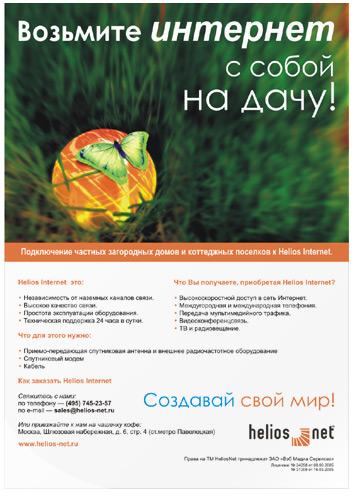 "Возьми спутник на дачу!"Перед студией Dinevdes!Gn была поставлена задача разработать дизайн полноцветных рекламных листовок HeliosNetЛистовки должны иллюстрировать услугу компании по подключению загородных домов и коттеджных поселков к спутниковым телекоммуникациям. В результате разработки идеи рекламной листовки, предложены три концепции. Первая - комфортно сидящая у загородного домика женщина, говорит с подругой, как ей хорошо теперь за городом: на домике красуется спутниковая тарелочка, и связь превосходная, и ТВ, и высокоскоростной доступ в Интернет. Вторая - красная тачка, а в ней ноутбук и спутниковая тарелка, а на ручке ещё и бабочка, как вариант - с "гламурненькой" девушкой. Третья - самый "простой" и, на самом деле, самый красивый и точный: шар (очень тёплый, летний, светящийся) и бабочка. Лучшей была признана более точная и чистая идея - в загородной летней траве теплый, светящийся шар с бабочкой. Дизайн листовки соответствует разработанной ранее визуальной концепции. Информация об услугах HeliosNet размещена наиболее удобным для восприятия образом. Идея и дизайн - Дмитрий Динёв ![]() ![]() |