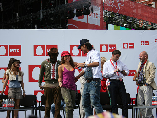 Первыми, под рев стоявших за ограждением поклонников, в народ вывели группу The Black Eyed Peas, следом вышли скромница Shakira и Дима Билан, дарящий публике воздушные поцелуи. Вице-президент МТС по маркетингу Гжегож Эш, слегка смущаясь повышенного внимания масс, прошел на сцену вместе с представителями «РМГ». Где-то среди администраторов и охраны фотографировался ди-джей радио DiFM Цепа. Акулы пера замерли в ожидании подробностей…