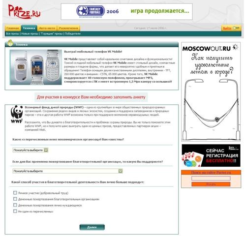 Компания IMS Interactive оказывает поддержку благотворительной деятельности WWF в РоссииКомпания IMS Interactive разработала и реализовала оригинальный проект в поддержку благотворительной деятельности Всемирного фонда дикой природы (WWF) в России. Основная цель проекта - привлечь внимание общественности к проблемам охраны природы, рассказать о результатах деятельности WWF в России и помочь организации в привлечении новых сторонников. С 17 июля до 15 сентября на сайте www.prize.ru посетителям предлагается заполнить интерактивную анкету, разработанную совместно IMS Interactive и WWF. Посетители, отметившие в анкете, что их беспокоят проблемы экологии и охраны природы, могут внести благотворительный взнос сразу после заполнения анкеты. Участник акции получает интерактивное письмо со ссылкой на платежную квитанцию, которую можно распечатать и оплатить в банке. Таким образом, люди неравнодушные к проблемам сохранения природы на нашей планете, могут помочь фонду материально. 15 сентября среди всех участников опроса будет разыгран ценный приз, предоставленный одним из сторонников WWF - мобильный телефон VK mobile. ![]() |