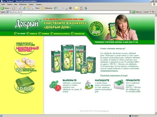 "BNT Alliance" разработало рекламную кампанию для соков "Добрый"Агентство креативных коммуникаций "BNT Alliance" разработало и проводит национальную промо-кампанию для соков "Добрый" - "Добрый дом". Середина и конец лета традиционно считаются сезоном спада потребления соков, поэтому главной целью акции является стимулирование продаж в этот период. В основе акции лежит творческий конкурс, участникам которого предлагается написать рассказ о том, каким они видят свой добрый дом, и вместе с эмблемами с указанием литража, вырезанными от любых упаковок сока "Добрый", прислать их на абонентский ящик акции. В качестве гарантированных призов первые 10 000 авторов получат теплые домашние пледы, 20 лучших - комплекты мягкой мебели, а главный победитель конкурса получит в подарок новый интерьер и съемки в телепередаче "Квартирный вопрос". Лицом конкурса в этом проекте стала Наталья Мальцева - ведущая телепередачи "Квартирный вопрос", которая также является экспертом и членом жюри конкурса. Кампания стартовала 15 июля и закончится телепередачей "Квартирный вопрос" с победителем конкурса, которая выйдет в эфир 14 октября на канале НТВ. Помимо рекламной кампании на телеканалах ОРТ, НТВ и ТНТ, в промо-кампании задействованы также интернет-сайт www.cok.ru, POSM, горячая телефонная линия и прямая почтовая рассылка. Состав творческой группы: Агентство "BNT Alliance": Креативный директор: Юрий Волков Арт-директор: Евгений Ледович Копирайтер: Дмитрий Грабин Директор проекта: Елена Беляева Продакшн видеоролика: "BUZZ production" Режиссер: Михаил Сегал ![]() ![]() ![]() ![]() |