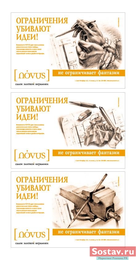 Безграничная фантазия от агентства elvisPelvisСеть креативных агентств elvisPelvis разработала креативную концепцию продвижения для петербургского салона элитной керамики [NOVUS] Перед Агентством стояла задача - разработать концепцию яркой и запоминающейся рекламной кампании, закрепляющей положение [NOVUS] в элитном сегменте. Целевая аудитория этого салона - потребители с высоким и очень высоким уровнем доходов и дизайнеры-архитекторы, занимающиеся дизайном интерьеров. Элитный сегмент не требует доказательств качества продукции и предполагает высокий уровень сервиса. ЦА ожидает уникальных дополнительных возможностей, не предоставляемых конкурентами. Ключевое положение новой стратегии [NOVUS], предложенное Агентством: [NOVUS] продает не плитку, а дополнительные возможности для клиентов. Какие возможности на рынке наиболее востребованы? Одна из главных проблем в рекламе и строительстве - отсутствие возможности адекватной реализации волшебной Идеи заказчика. "Хорошая Идея всегда состоит из деталей, от которых нельзя отказываться. В противном случае Идея много теряет!" - золотое правило дизайнера. [NOVUS] предоставляет возможность реализовать любую смелую Идею заказчика. Обеспечивает реализацию фантазий особенный, отличающийся от других предложений, ассортимент керамической плитки салона NOVUS. Предложенная Агентством новая позиция салона звучит так: [NOVUS] - не ограничивает фантазию. На первом этапе концепция реализуется в виде макетов для печатных изданий. Состав творческой группы Руководство проектом: Илья Вологуров, Михаил Жихаревич Креативная группа: Дмитрий Чеботков, Евгений Шрага, Станислав Гришелев, Галина Фоминых Художник: Ирина Еременко Дизайнер: Игорь Шматко ![]() |