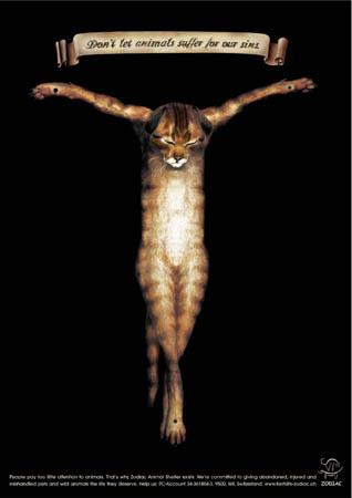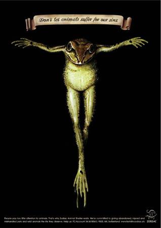 Распятая лягушка - вид борьбы за права животныхВесьма оригинальная рекламная кампания разработана агентством Publicis Цюрих для общества Zodiac, занимающегося защитой животных. Не позволяйте животным страдать за наши грехи, говорит слоган этой рекламной кампании, размещенный над изображением распятых лягушки, собаки и кота. ![]() ![]() ![]() |