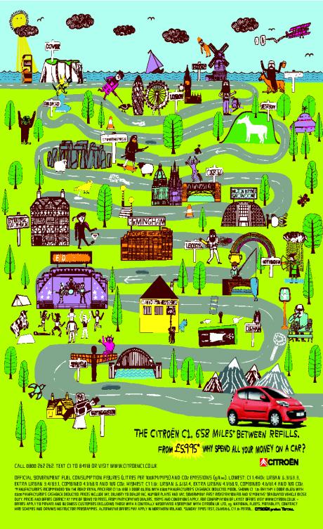 Добавки не требуетсяИз пункта А в пункт Б выехал новенький Citroen C1… Так начинается рекламная история, придуманная Euro RSCG (Лондон), для продвижения экологических и экономических характеристик этого авто. Визуальный ход незамысловат, но привлекателен. Витиеватая дорога от деревушки Гретна Грин, что в Шотландии, до порта Дувр, что на британском берегу Па-де-Кале, протянулась на 658 миль — как раз то самое расстояние, на которое хватит одной заправки неприхотливого С1. ![]() Агентство: Euro RSCG (Лондон) Артдиректор, копирайтер: Jonathan Cockett, Alex Avis Иллюстратор: Marcus Oakley KAK.RU |