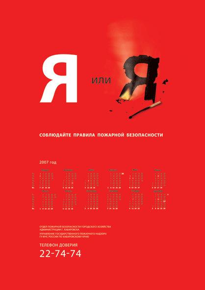 В помощь пожарнымАгитплакат — вещь исключительно нужная и полезная, а если дело касается нашей безопасности, то значение его только возрастает. К сожалению, форма для материалов такого содержания, в большинстве своем, оставляет желать лучшего. И уж конечно, вряд ли у кого-то возникнет желание украсить свои стены планами эвакуации или «веселыми картинками» по пожарной и прочей безопасности. Управления МЧС России по Хабаровскому краю решило изменить отношение к этому вопросу, прежде всего, в своих офисах. Разработку агитационного плаката по пожарной безопасности поручили хабаровской студии «Ласков Йончер». Главное пожелание заказчика выражалось в том, чтобы «все вешали на стену». Поэтому дизайнеры сразу решили уйти от стереотипных изображений суровых пожарных и спецтехники на фоне огня. В итоге был выбран самый лаконичный, образный и всем пригодящийся в работе вариант, с календарем на 2007 год. Теперь такие плакаты встречаются в самых разных учреждения края. ![]() KAK.RU |